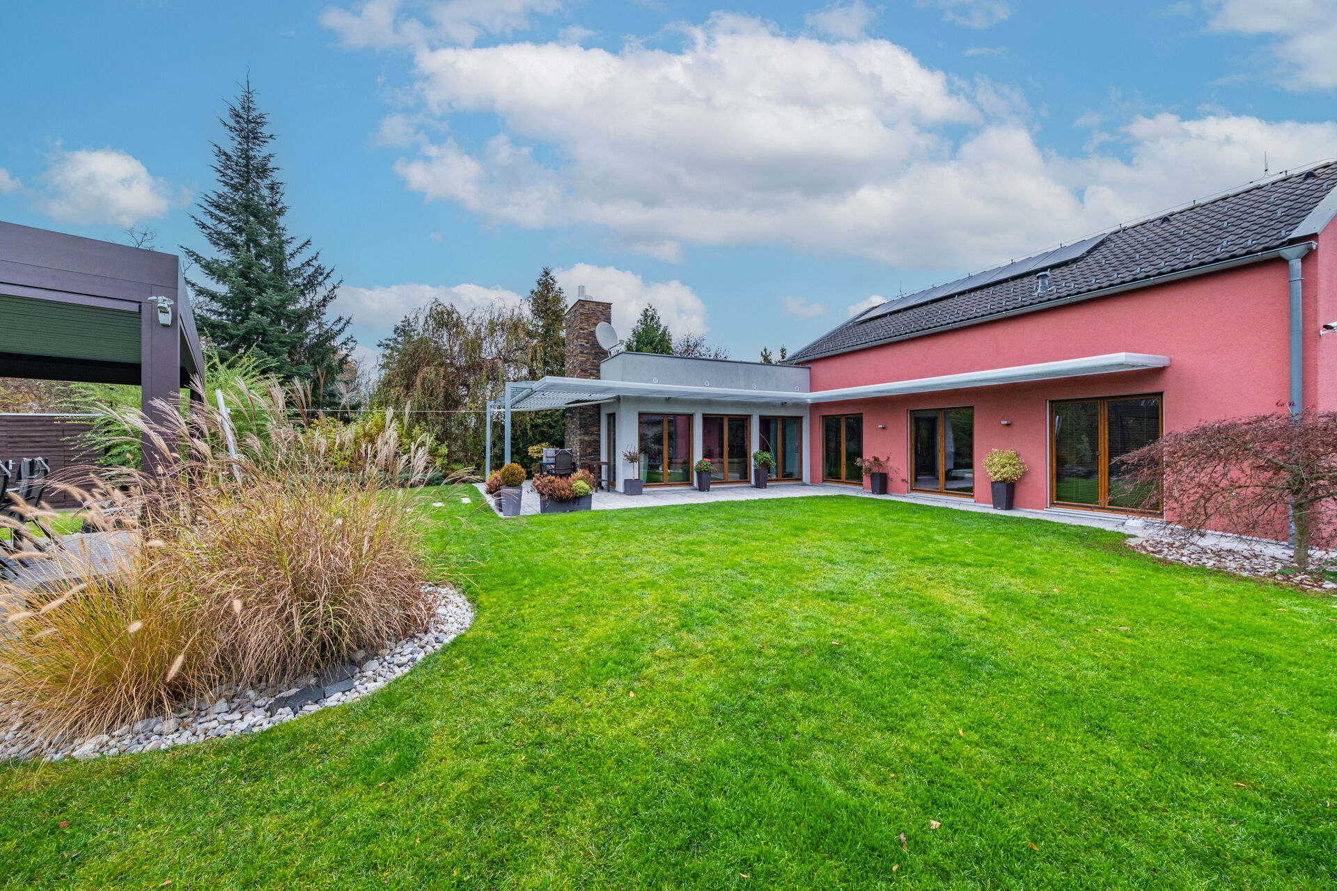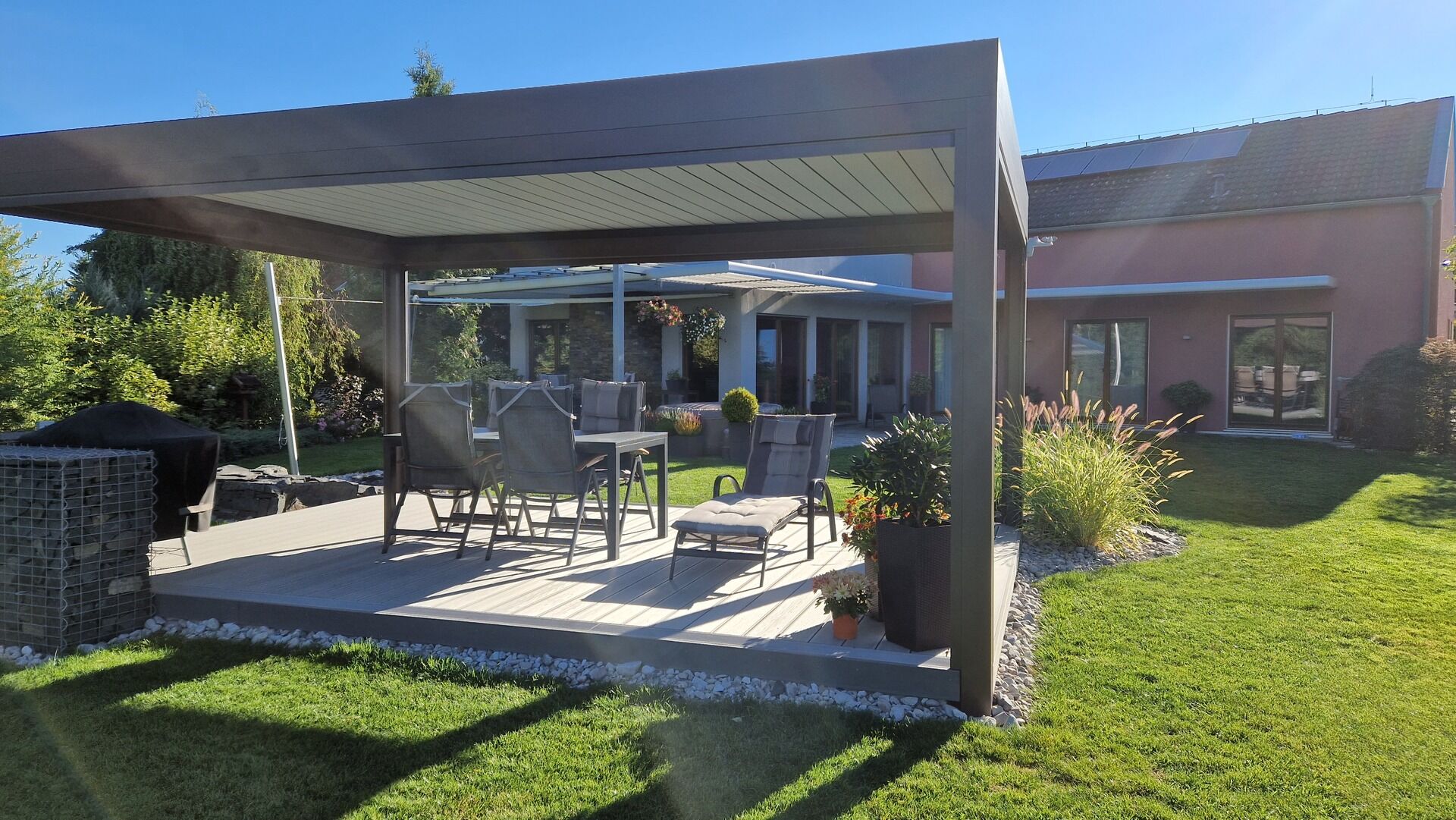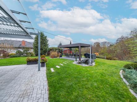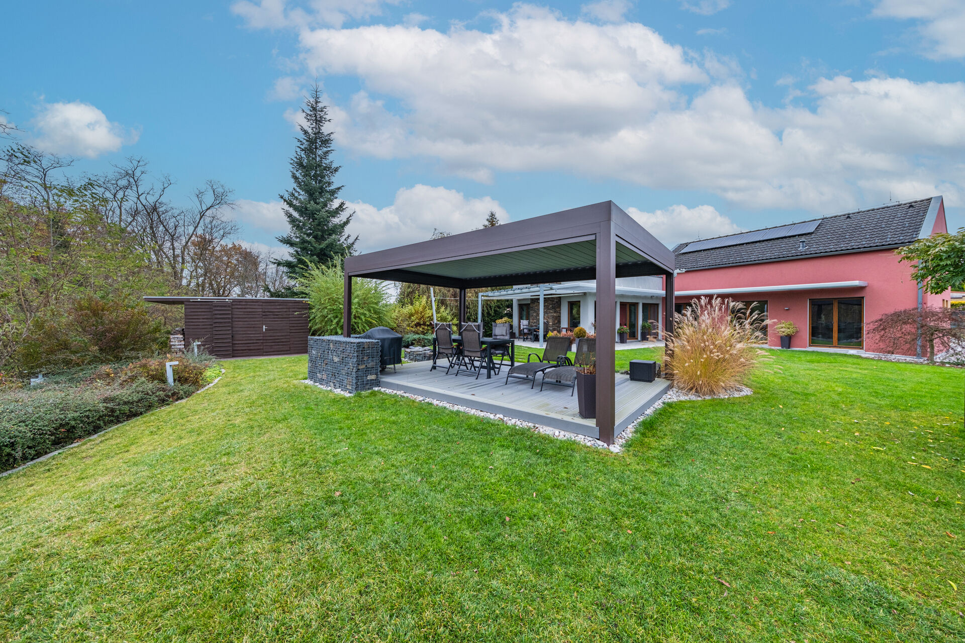 V zahradě je nově vybudováno sezení pod hliníkovou bioklimatickou pergolou s elektricky ovládanými stěnami a osvětlením, rolovací stínící