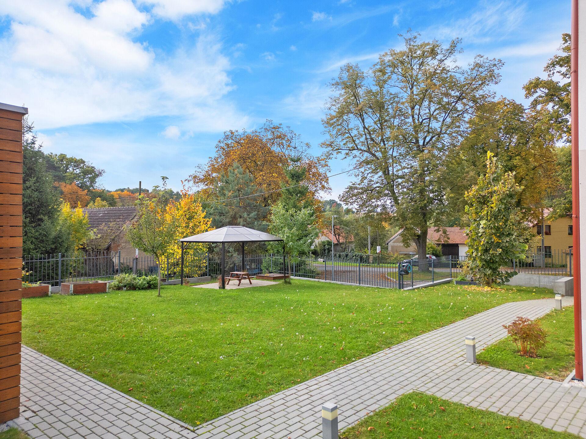Výborná je i dostupnost do Prahy – autobusová zastávka je přímo před domem a na metro se pohodlně dostanete.