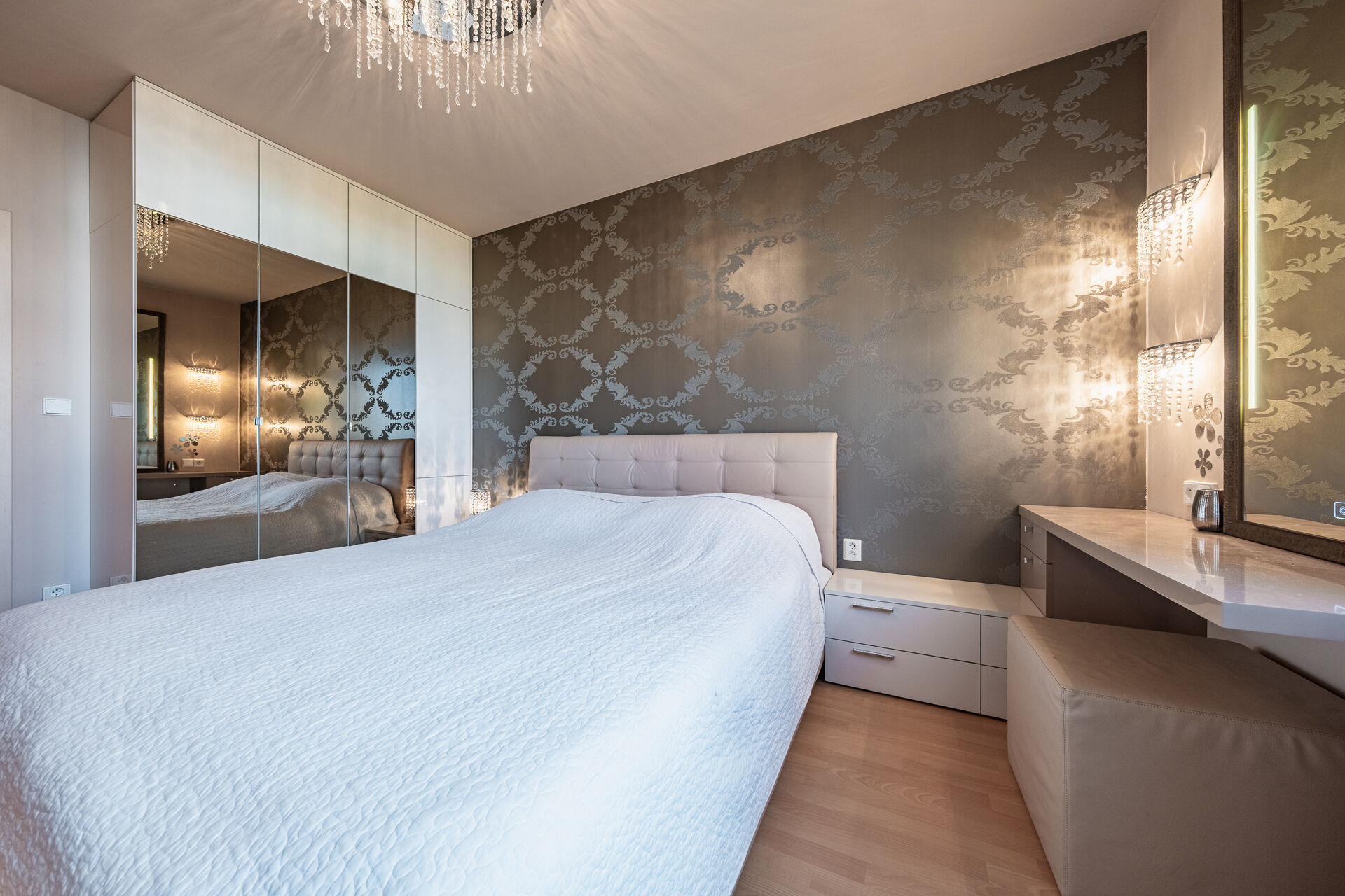 Každý detail tohoto bytu byl pečlivě navržen bytovým architektem – všechno vybavení je na míru, z luxusních materiálů v elegantních hnědo‑bílých tónech. Vstupte, položte tašku s osobními věcmi a — nic dalšího už nemusíte řešit. Jste připraveni začít žít.