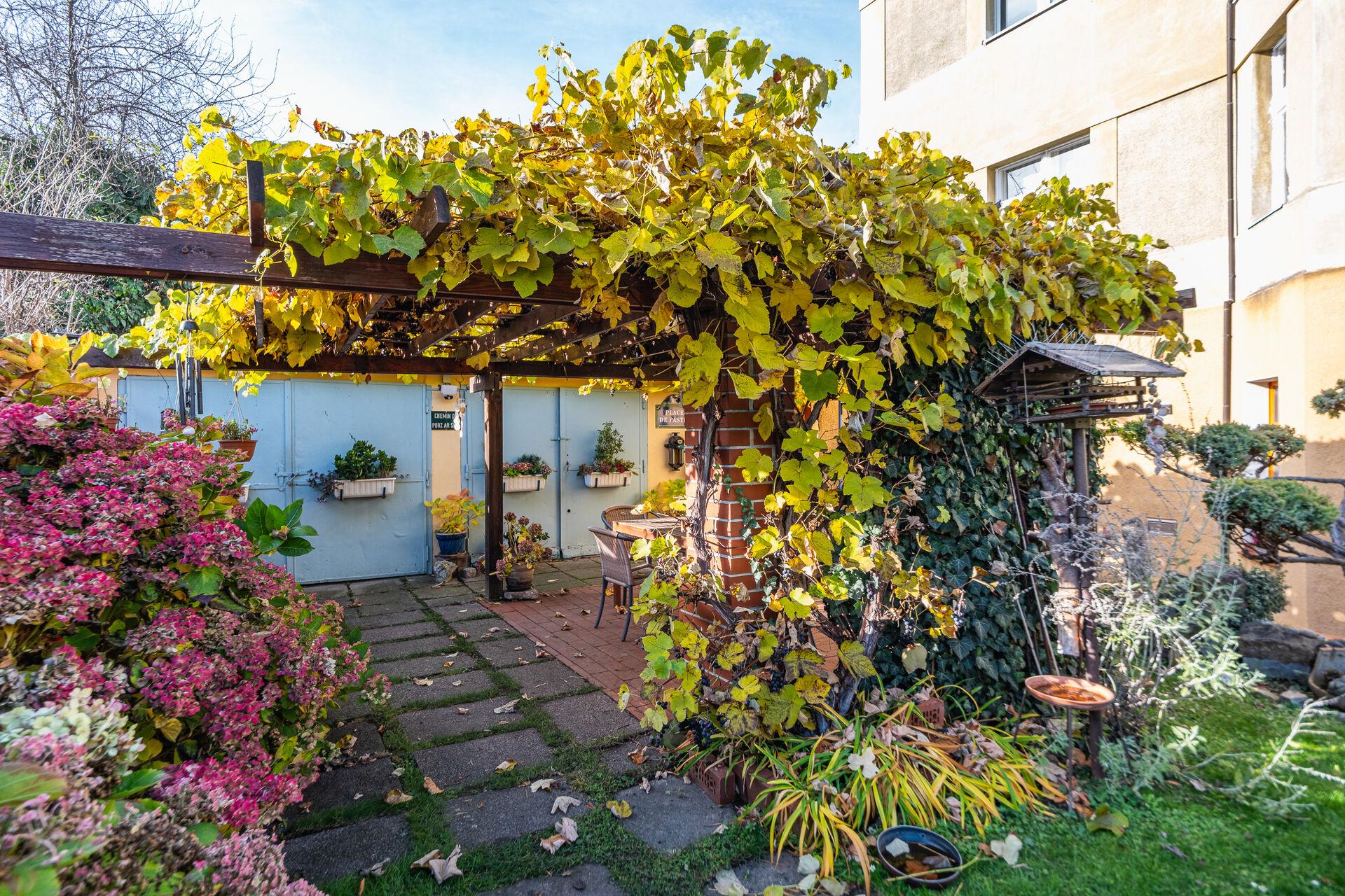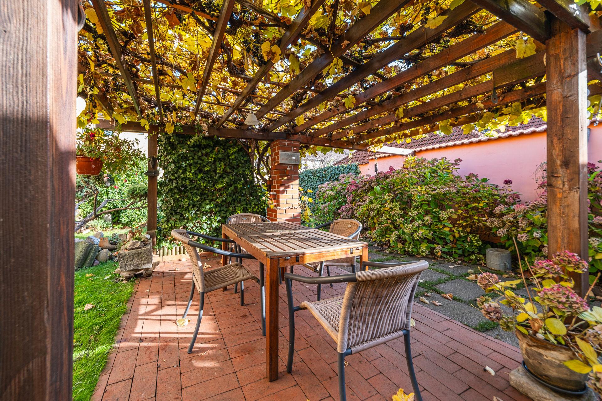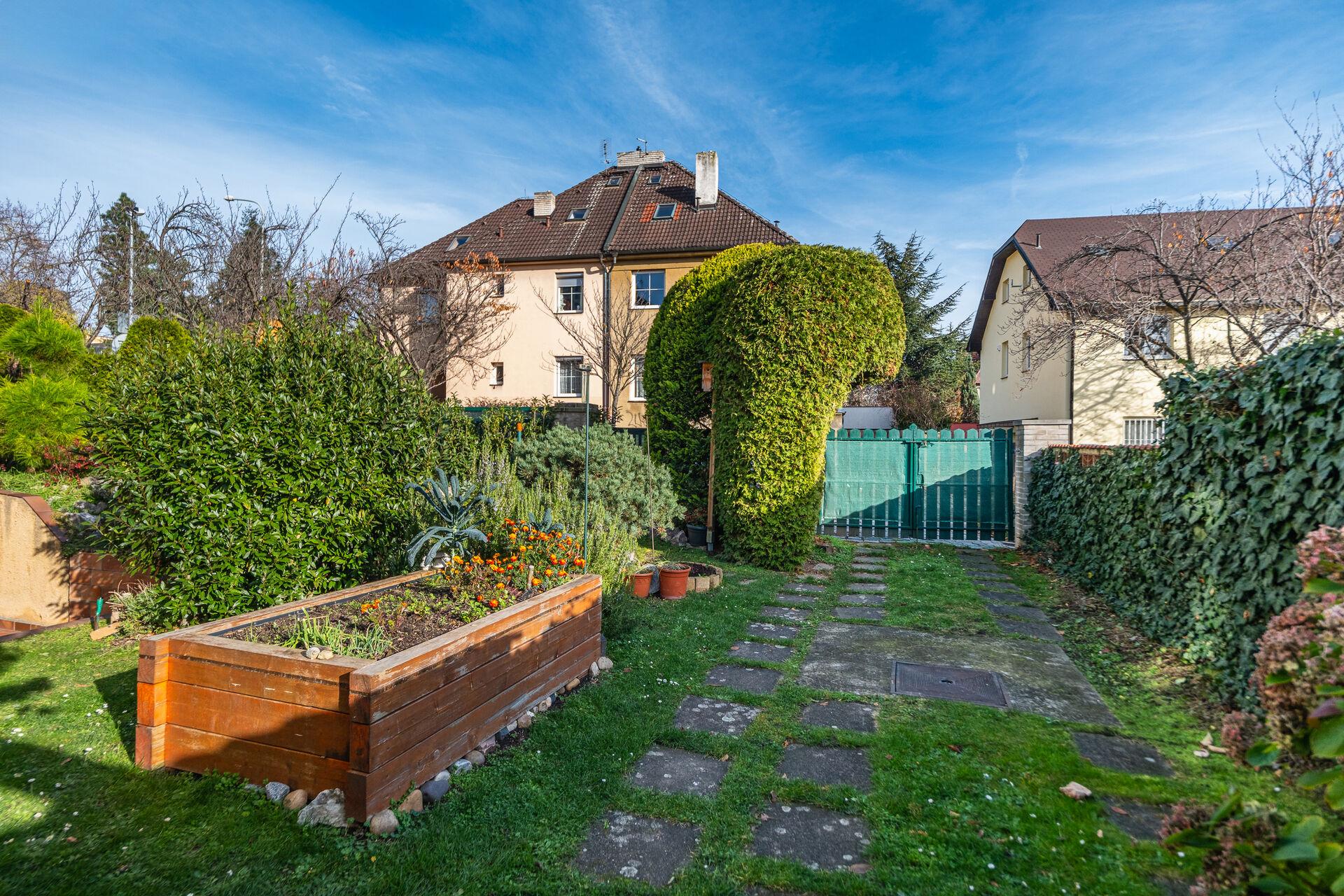 U domu je nádherná udržovaná vzrostlá zahrada, která v sobě ukrývá zahradu s terasou, posezením a garážemi.